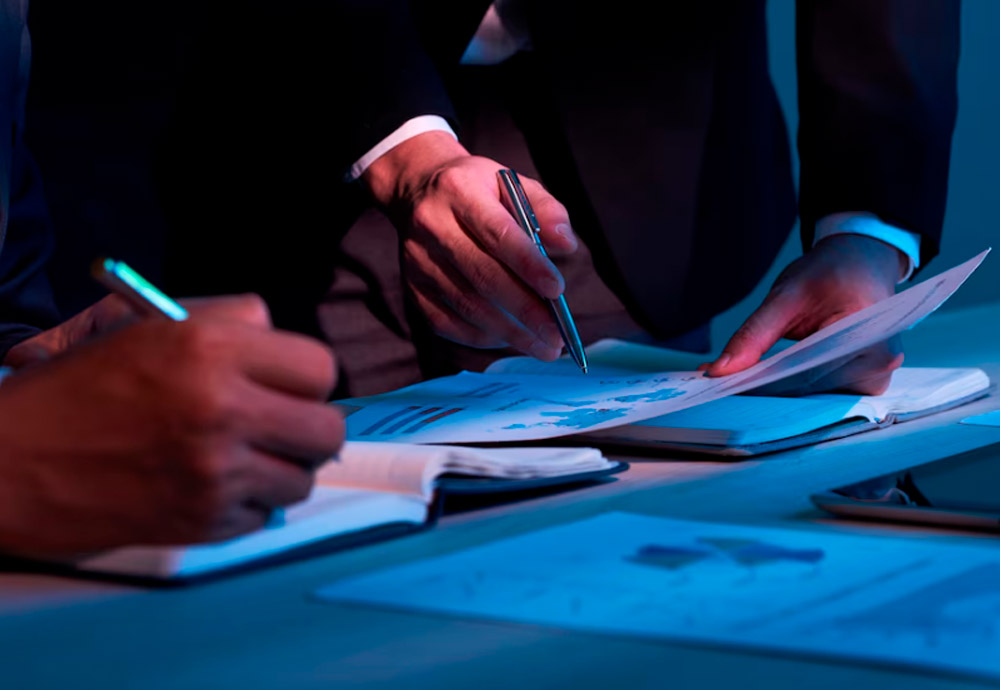 Business professionals reviewing financial documents and taking notes during a meeting at a blue-lit workspace.