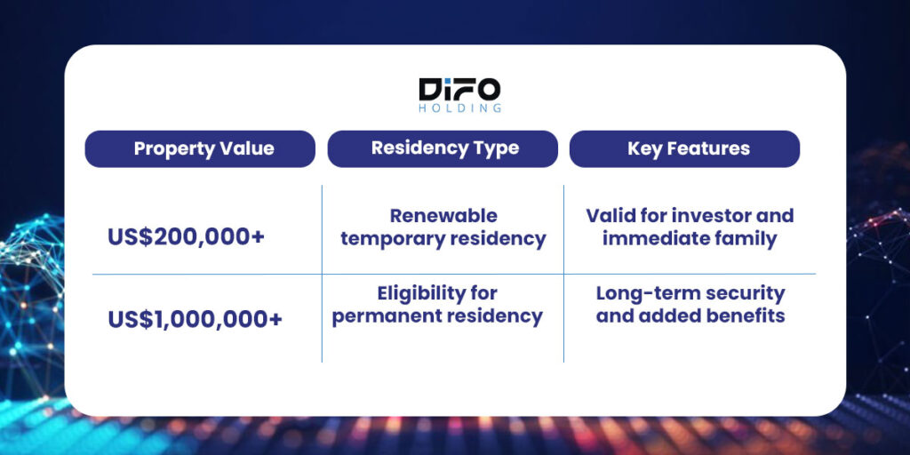 – Temporary residency through a minimum property purchase of US$200,000